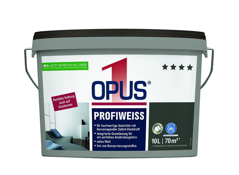 Darf nicht in die Hände von Kindern gelangen. Achtung! Beim Sprühen können gefährliche lungengängige Tröpfchen entstehen. Aerosol oder Nebel nicht einatmen. Während der Verarbeitung und Trocknung für gründliche Belüftung sorgen. Essen, Trinken und Rauchen während des Gebrauchs der Farbe ist zu vermeiden. Bei Berührung mit den Augen oder der Haut sofort gründlich mit Wasser abspülen. Nicht in die Kanalisation, Gewässer oder ins Erdreich gelangen lassen. Reinigung der Werk zeuge sofort nach Gebrauch mit Wasser und Seife. Bei Schleifarbeiten Staubilter P2 verwenden. Spritznebel nicht einatmen. Kombiilter A2/P2 und Schutzbrille verwenden. Bei Spritzverarbeitung Gesichtsmaske mit Partikelilter P2 gegen Sprühnebel benutzen. Wird OPUS1 Profiweiss mit einer Pigmentpaste oder Abtönpaste abgetönt, die nicht konform zu den Anforderungen des Blauen Engels ist, entspricht die abgetönte Farbe nicht mehr den Kriterien des Blauen Engels.
